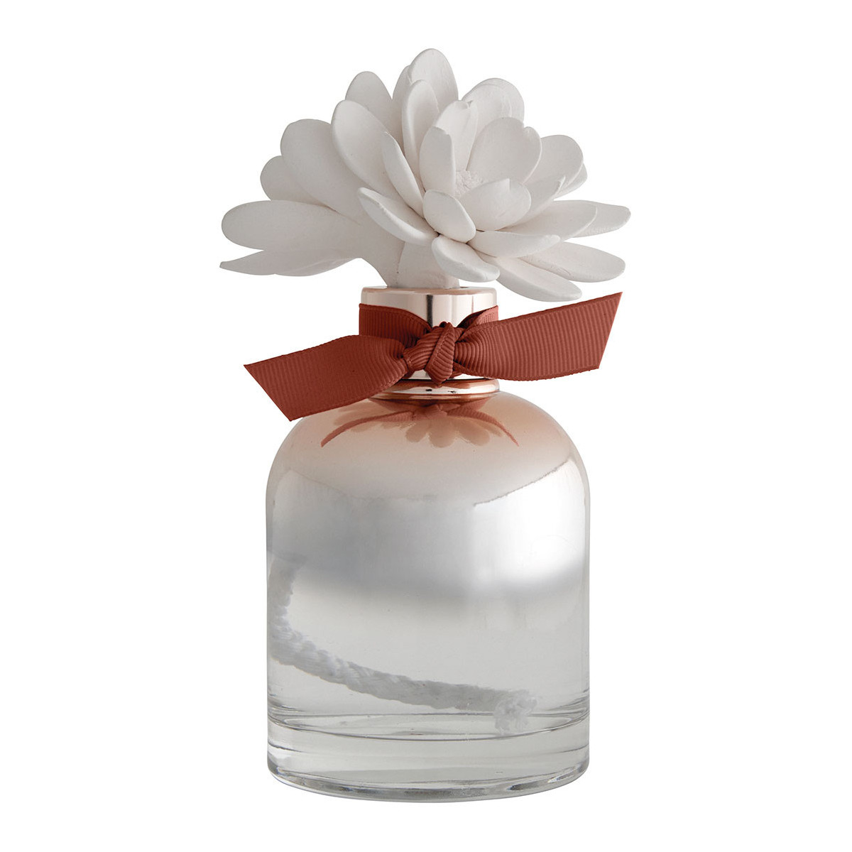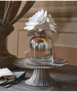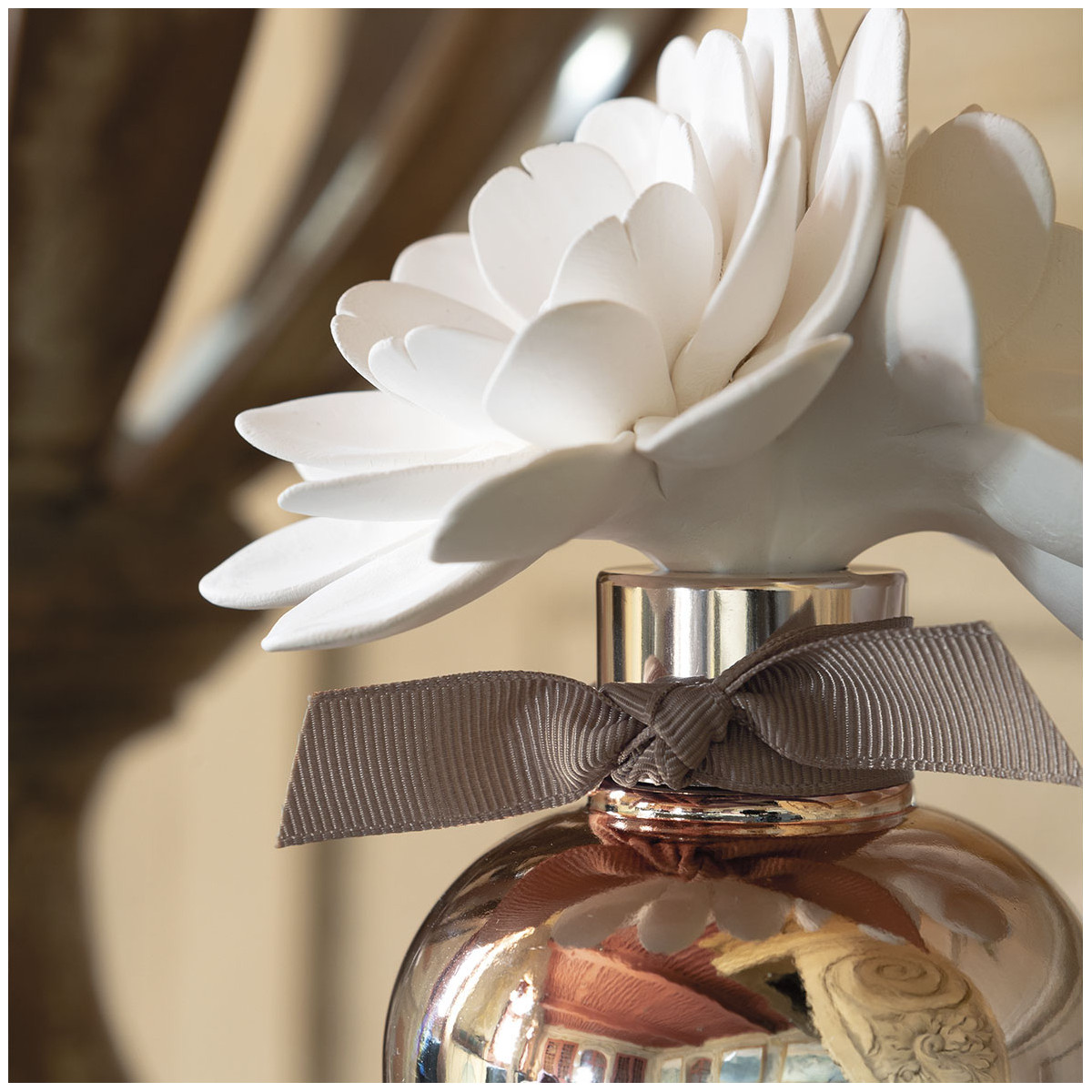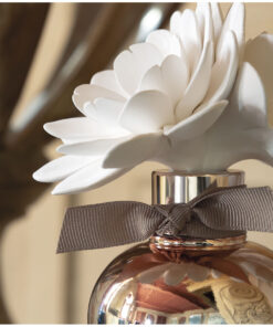 Ontdek de elegante Valse Florale geurverspreider die uw huis langdurig zal parfumeren. Handgemaakte, twee ineengestrengelde porseleinen biscuitbloemen rusten in hun koperkleurige tie-dye glazen fles.